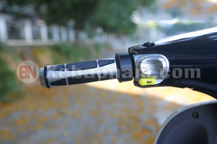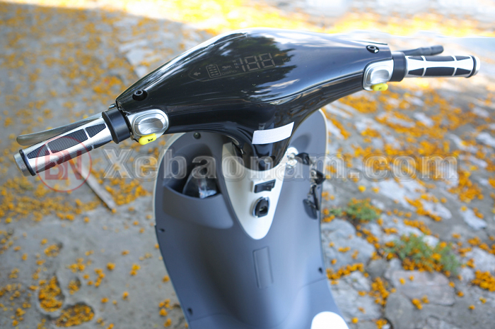 Hai tay lái của xe máy điện Gogo SS Dibao được thiết kế vô cùng cân đối, các nút bấm điều khiển chức năng xe được sắp xếp một cách hợp lý cho phép người điều khiển dễ dàng thao tác khi vận hành xe cũng như chủ động hơn trong các tình huống có thể xảy ra trên đường. Tay lái thiết kế khá là độc với chất liệu cacbon cao cấp phủ lên lớp sơn bạc chống rỉ sét kết hợp với các điểm G làm từ cao su mềm có tác dụng bám thay và giúp tay lái luôn vững vangf không bị trơn trượt và còn có thể hút ẩm, hút mồ hôi tay khá tốt.